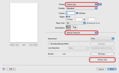 Select your fax → select [Special Features] → click [Printer Info].