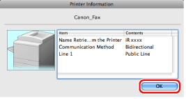 If the fax driver name displayed at the top of the [Printer Information] dialog box and the fax name displayed as [Name Retrieved from the Printer] do not correspond correctly, you may not be able to use the fax functions correctly. If the names do not correspond, delete the fax you have added in [System Preferences] and adding it again. For details, see the "Mac Fax Driver Installation Guide" (see " Installation").