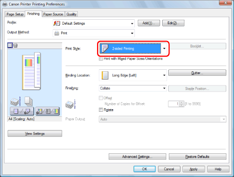 The default setting for [Print Style] is [2-sided Printing]. You can also change the default setting to [1-sided Printing]. For instructions on changing the default settings, see "Configuring the Default Print Settings."