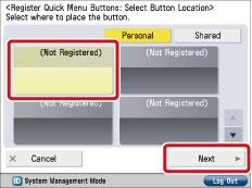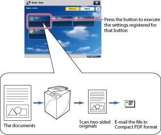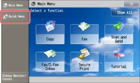 The Quick Menu is a function that increases the efficiency of routine and repetitive office tasks that use the machine. You can create and register a series of frequently used functions such as Copy, Scan and Send, and Scan and Store in one button.