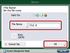 Press [File Name] → enter a file name using the keyboard → press [OK].
