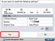 If you select [On], when the registered button is recalled, a screen confirming the settings is displayed. For more information on the confirmation screen, see " Sending a Document Using the Quick Menu Button." If you select [Off], when the registered button is recalled, a screen confirming the settings is not displayed.