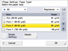 You can register paper types if paper types for the loaded paper are not displayed on the detailed setting list. For instructions on registering paper types, see "Registering/Editing Custom Paper Types."