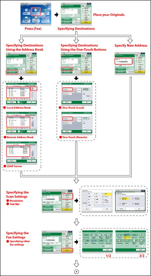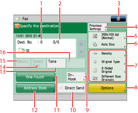 Press to set useful fax functions such as sending different sized originals together or 2-sided originals.