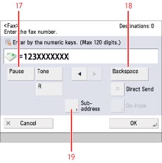 Press to insert a pause of several seconds in the fax number that you are dialing. If you press [Pause] betwewn numbers, the letter <p> appears between the numbers. If you press [Pause] at the end of a number, the letter <P> appears at the end of the number. When dialing an overseas number, insert a pause after the country code, and at the end of the telephone number. (See "Pause Time.")