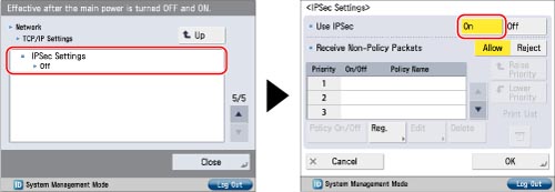 Press [IPSec Settings] for [TCP/IP Settings] → [On] for <Use IPSec>.