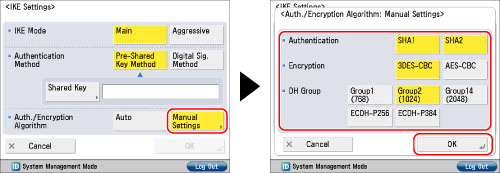 Select [Manual Settings] for <Auth./Encryption Algorithm> → specify the authentication and encryption algorithm to apply to the IKE SA → press [OK].