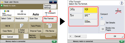 You can select additional settings if you store the scanned file in the PDF, XPS, or OOXML format. Refer to the following for instructions on setting each type of PDF, XPS, or OOXML:
