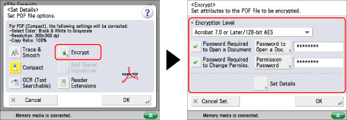* Appears only if you select [Acrobat 9.0 or Equivalent] in [256-bit AES Settings for Encrypted PDF] in [Function Settings] (Settings/Registration). (See "Changing the PDF Encryption Level from Acrobat 10.0 or Equivalent to Acrobat 9.0 or Equivalent.")