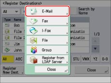 The first character that you enter for the name is used for sorting the destination list when you press keys, such as [ABC], [DEF], and [GHI], on the Address Book screen. If [Search by Name] is pressed on the Address Book screen, a screen for narrowing the search in the Address Book appears.