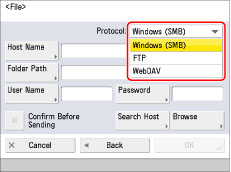 To save files in the Advanced Space of another imageRUNNER ADVANCE series machine with an imagePASS attached, select [WebDAV]. (Windows (SMB) cannot be used.)