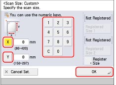 Press [X] and [Y] → use the numeric keys to enter the scan size in mm → press [OK].