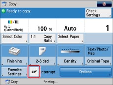 Pressing [Interrupt] does not immediately stop the current job. Printing of the current job stops only when the actual printing of the priority or interrupt copy starts.
