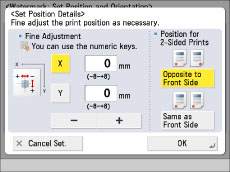To set the printing position for the back side when performing two-sided copying, select [Opposite to Front Side] or [Same as Front Side] → press [OK].