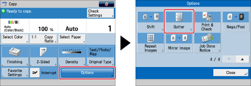 [Gutter] shifts the entire original image by the designated width. Therefore, an original whose image extends all the way to the edges of the sheet may be partially cut off on the copy.