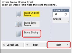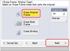 This mode enables you to remove the shadows and lines that appear when scanning various types of originals. There are three types of Erase Frame: [Erase Original Frame], [Erase Book Frame], and [Erase Binding].