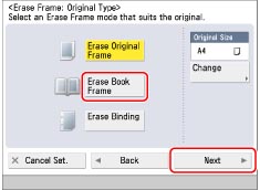 You can set the Erase Book Frame mode only for the original paper sizes shown on the touch panel display.
