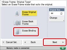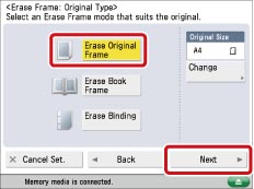 This mode enables you to remove the shadows and lines that appear when scanning various types of originals. There are three types of Erase Frame: [Erase Original Frame], [Erase Book Frame], and [Erase Binding].