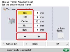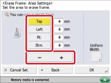 Press [Center] and [Sides] → press [-] or [+] to set the desired Erase Frame width.