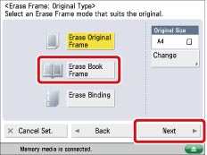 You can set the Erase Book Frame mode only for the original paper sizes shown on the touch panel display.