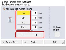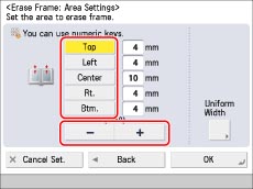 Specify the location of the binding holes → press [-] or [+] to set their respective erase frame widths.
