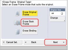 You can set the Erase Book Frame mode only for the original paper sizes shown on the touch panel display.