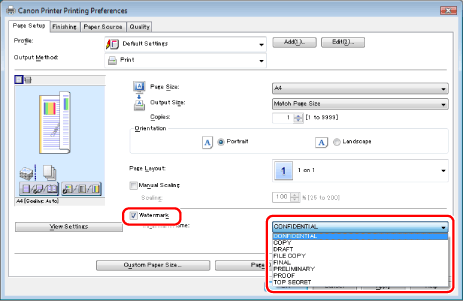 You can print a watermark (such as "CONFIDENTIAL" or "COPY") on a document created using an application. You can also register customized watermarks in addition to the predefined watermarks.