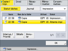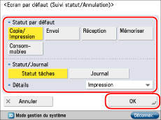 Si [Copie/Impression], [Statut tâches] et [Impression] sont définis comme Ecran par défaut (Suivi statut/Annulation) :
