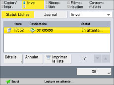 Si [Envoi], [Statut tâches] et [Fax] sont définis comme Ecran par défaut (Suivi statut/Annulation) :