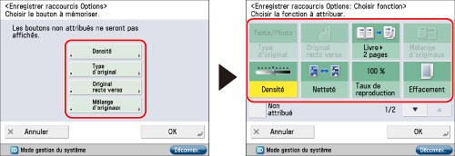 Il est possible de mémoriser des réglages dans les touches de raccourcis affichées à l'écran Fax. Jusqu'à quatre touches souhaitées peuvent ainsi être mémorisées dans [Options].