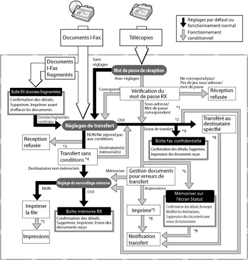 Lorsque la machine reçoit des télécopies ou des fichiers I-Fax, ils sont traités comme indiqué ci-dessous :