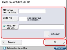 Il est possible de définir et mémoriser un nom et un code PIN pour la boîte fax confidentielle. Ce nom et ce code PIN peuvent en outre être initialisés.