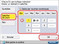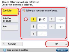 Il est possible de choisir [Quotidien] pour Heure début verrouillage mémoire et [Spécifier les jours] pour Heure fin verrouillage mémoire, et vice versa.
