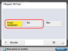 Les rapports peuvent être imprimés uniquement si du papier au format A3, A4 ou A4R (ordinaire, recyclé, fin ou couleur) est chargé dans la source d'alimentation du papier dont les réglages sont définis sur "Oui" dans [Autre] sous [Activer/désactiver choix auto cassette] dans [Réglages de fonction] (Réglages/Enregistrement). Cependant, si l'option [Tenir cpte de Type papier] est réglée sur "Oui" pour [Copie] dans [Activer/désactiver choix auto cassette], il est impossible d'imprimer à partir d'une source d'alimentation pour laquelle le papier couleur a été sélectionné. (Voir "Activation de la sélection automatique de la cassette".)