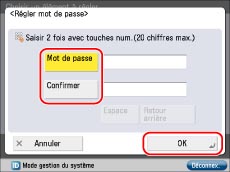 Saisir [Mot de passe] et [Confirmer] → appuyer sur [OK] → [OK].