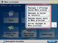 dans la partie supérieure droite de l'écran, l'écran suivant s'affiche. Sélectionner les réglages dans l'écran affiché et régler l'affichage de l'écran Menu principal.