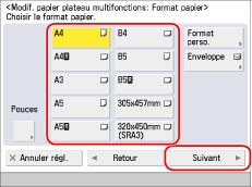 Le format papier spécifié doit être identique à celui du papier chargé dans le plateau multifonctions. Si l'on sélectionne un format de papier ou d'enveloppe différent, un bourrage papier risque de se produire.