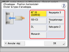 Le format d'enveloppe spécifié doit être identique à celui des enveloppes chargées dans le plateau multifonctions. Si l'on sélectionne un format de papier ou d'enveloppe différent, un bourrage papier risque de se produire.