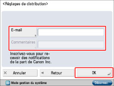 Entrer le commentaire qui sera automatiquement ajouté à l'e-mail. Si le nom du modèle est saisi, on peut identifier le statut de périphérique dont l'e-mail fait référence.