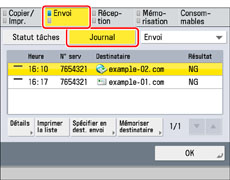 L'envoi a échoué. L'heure de la communication et le code d'erreur sont également indiqués en regard de "NG".