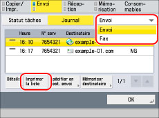 Pour imprimer l'historique des opérations d'envoi correspondant au Rapport de télécopie, sélectionner [Fax] dans la liste déroulante. (Voir "RAPPORT D'ACTIVITES FAX - TX/RX".)