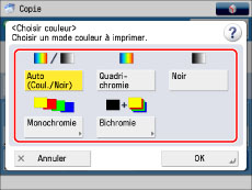 Si [Utiliser Auto (Couleur/Noir)] sous [Choisir réglages couleur copie] est défini sur "Non", [Auto (Coul./Noir)] ne s'affiche pas. (Voir "Limitation de l'utilisation de Choix auto. des couleurs".)