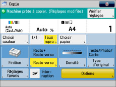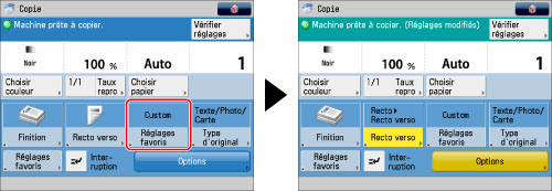 Si [Recto verso] et [2 sur 1] sont mémorisées comme des touches de raccourci, elles s'affichent comme illustré ci-après.
