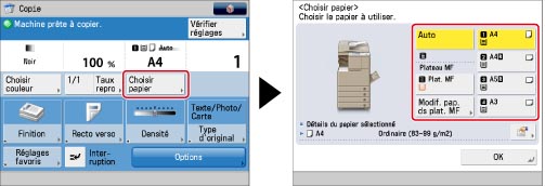 Si l'alimentation de papier est effectuée à partir du plateau multifonctions pour la tâche en cours, le papier pour la tâche suivante peut être sélectionné à partir de [Modifier pap. ds plat. MF]. (Voir "Réservation d'une tâche de copie avec le plateau multifonctions".)