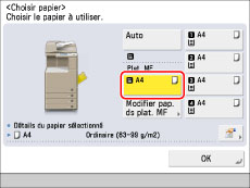 Si le papier chargé dans le plateau multifonctions n'est pas celui à spécifier, retirer toutes les feuilles puis charger le papier à spécifier dans le plateau multifonctions. (Voir "Chargement du papier dans le plateau multifonctions".)