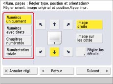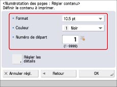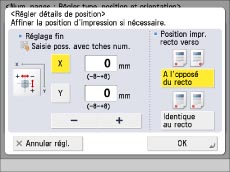 Si le même emplacement d'impression du numéro est sélectionné pour n'importe quelle combinaison de deux modes parmi les suivants : [Numérotation jeux copies], [Filigrane] ou [Date d'impression], un message demandant la confirmation s'affiche lorsque l'on appuie sur