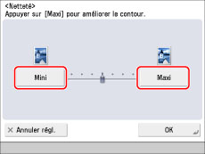 Pour copier des originaux comportant du texte ou des lignes fines, sélectionner une netteté [Maxi]. Pour copier des originaux contenant des photographies imprimées ou d'autres demi-teintes, sélectionner une netteté [Mini].