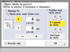 Si le même emplacement d'impression du numéro est sélectionné pour n'importe quelle combinaison de deux modes parmi les suivants : [Numérotation des pages], [Numérotation jeux copies] ou [Date d'impression], un message demandant la confirmation s'affiche lorsque l'on appuie sur