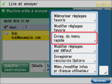 Si [Infos auth. conn. périph.] est sélectionné pour [Infos utilisées pour TX/navigation fichier] sous [Réglages de fonction] (Réglages/Enregistrement), un mot de passe pour un destinataire de fichiers n'est pas enregistré dans un bouton personnel ou un bouton partagé dans le Menu rapide. Pour plus d'informations sur les réglages de [Infos utilisées pour TX/navigation fichier], voir "Spécification de la méthode d'authentification pour le serveur de fichiers".