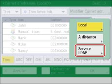 Si l'on appuie sur [Début rech.] sans définir de critères de recherche, toutes les adresses mémorisées sur le serveur LDAP sont affichées.